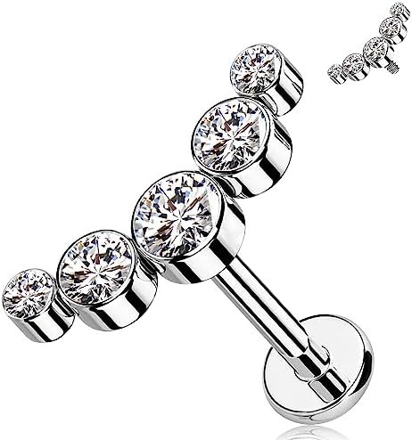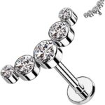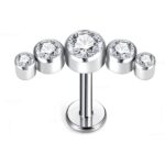 Labret fabricado en titanio grado implante, ideal para perforaciones por su alta biocompatibilidad, resistencia y acabado seguro para la piel. Presenta un diseño tipo cluster con cinco zirconias engarzadas: una central de mayor tamaño acompañada por cuatro laterales más pequeñas, logrando un efecto equilibrado, luminoso y con presencia.