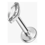 Labret fabricado en titanio grado implante, ideal para perforaciones por su alta biocompatibilidad, resistencia y acabado hipoalergénico. Presenta un cristal corte marquesa engarzado con garras, que aporta un brillo elegante y una forma alargada que estiliza visualmente la perforación.